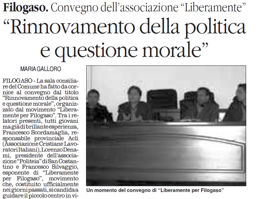 FILOGASO – La sala consiliare del Comune ha fatto da cornice al convegno dal titolo “Rinnovamento della politica e questione morale”, organizzato dal movimento “Liberamente per Filogaso”. Tra i relatori presenti, tutti giovani ma già di brillante esperienza, Francesco Scordamaglia, responsabile provinciale Acli (Associazione Cristiane Lavoratori Italiani), Lorenzo Denami, presidente dell’associazione “Politeia”di San Costantino Calabro […]
