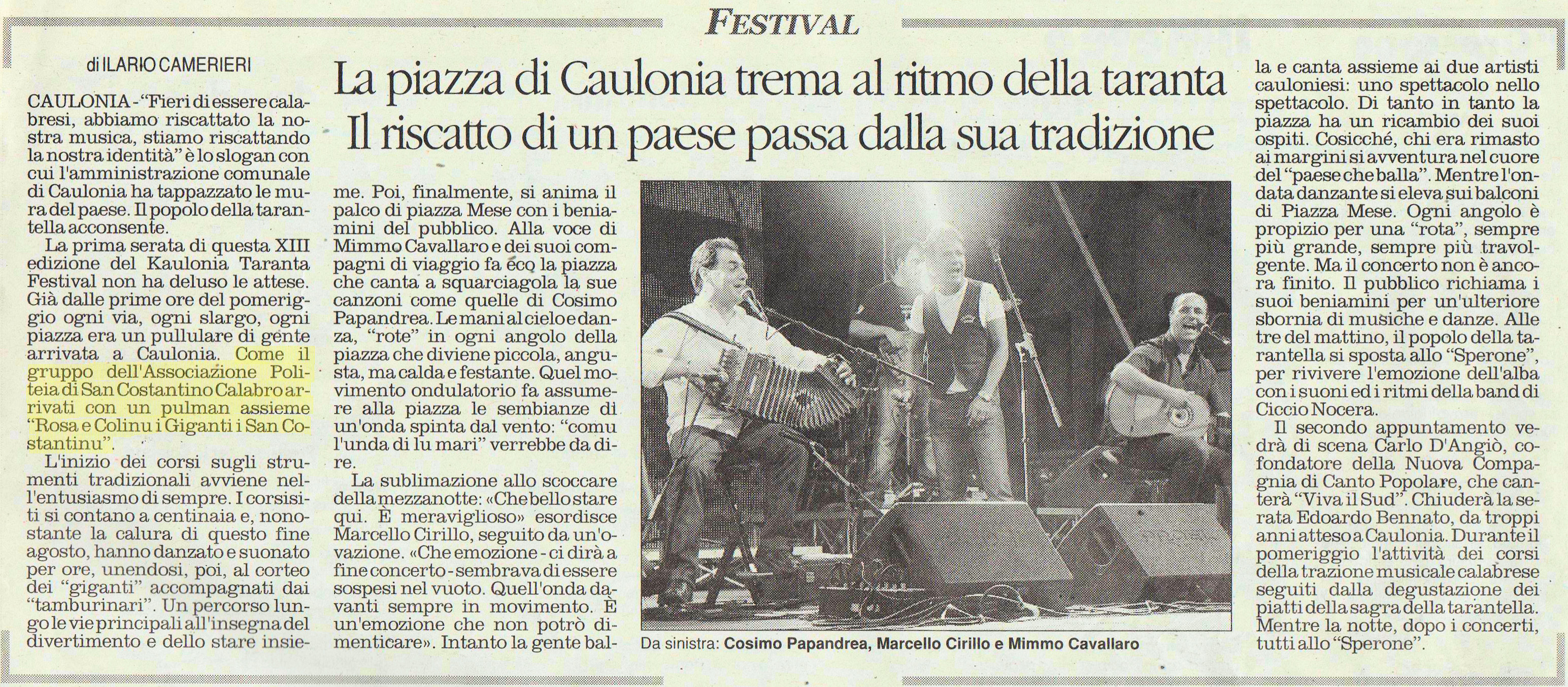 “Fieri di essere calabresi, abbiamo riscattato la nostra musica, stiamo riscattando la nostra identità” è lo slogan con cui l’amministrazione comunale di Kaulonia ha tappezzato le mura del paese. Il popolo deòlla tarantella acconsente. La prima serata di questa XIII edizione del Kaulonia Taranta Festival non ha deluso le attese. Già dalle prime ore del […]